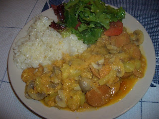 Fiz um esturgido de cebola e alho, juntei os cogumelos frescos cortados às fatias, em seguida a courgette cortada aos cubos e as lentilhas. Deixei fritar um pouco até libertar algum suco, juntei o seitan cortado às rodelas, sal, água e piri-piri. Deixei estufar um pouco para as lentilhas ficarem tenras e ...voilá!